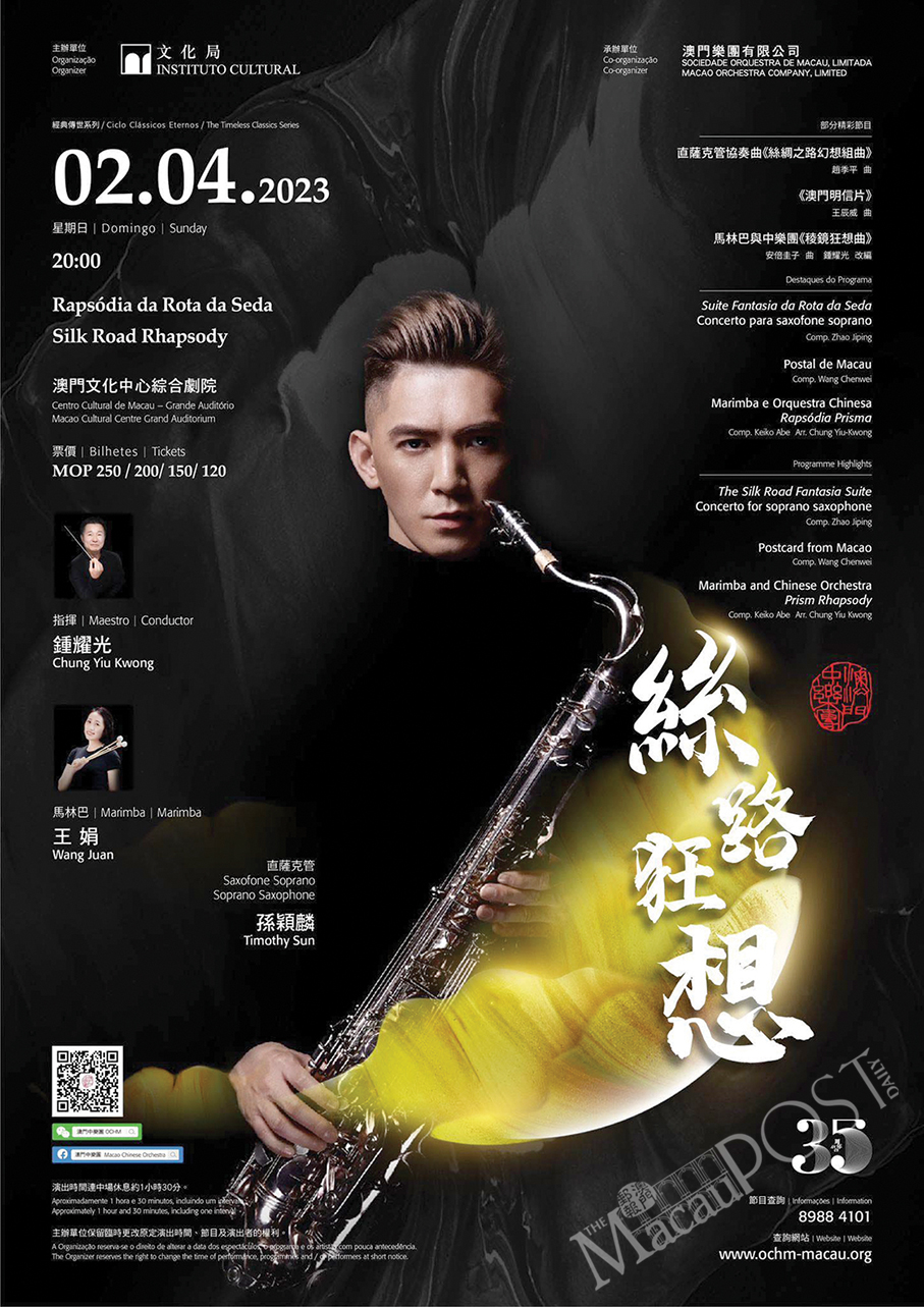 In an exclusive interview, local saxophonist Timothy Sun (孫穎麟) has told The Macau Post Daily that he will perform solo with the Macao Chinese Orchestra (OCHM) on April 2.