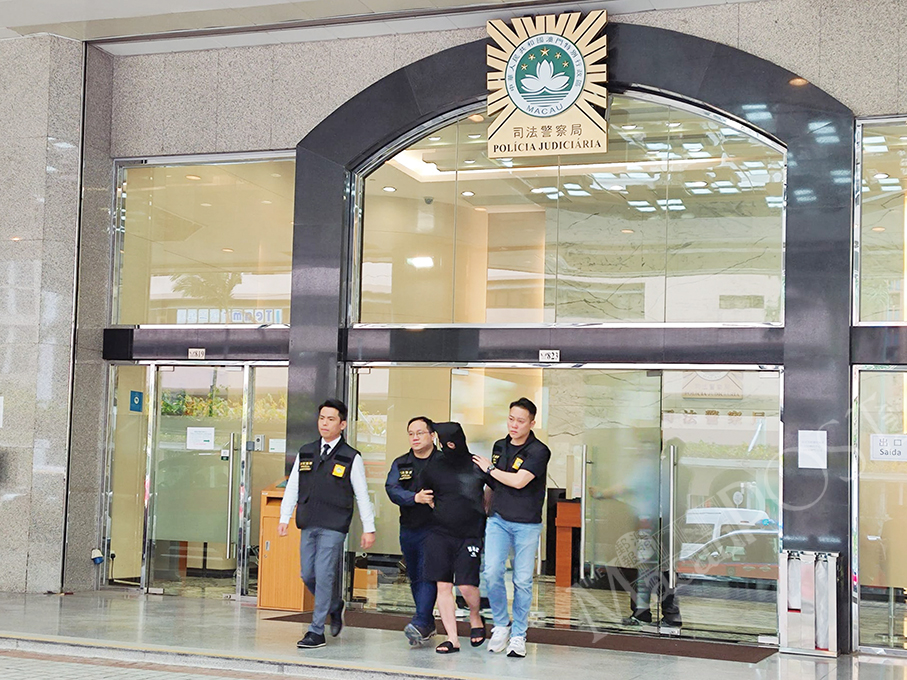 Judiciary Police (PJ) officers escort the hooded Vietnamese suspect to a PJ vehicle outside the PJ headquarters in Zape yesterday. – Photos: William Chan