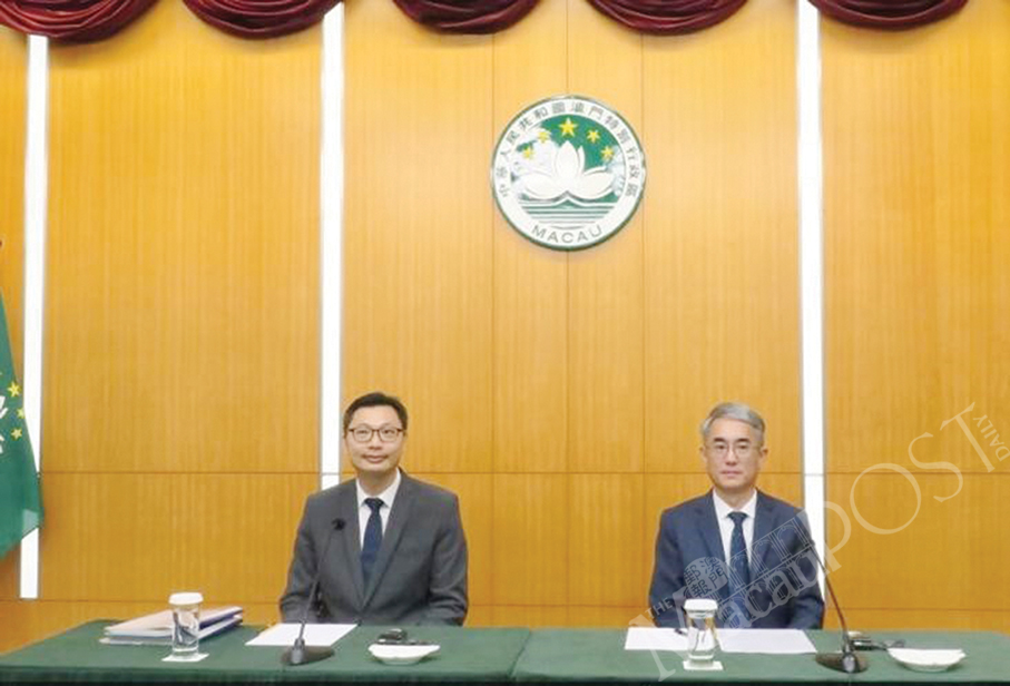 Secretary for Administration and Justice André Cheong Weng Chon (right) and Identification Services Bureau (DSI) Director Chao Wai Ieng address Friday’s Executive Council press conference at Government Headquarters. – Photo courtesy of TDM