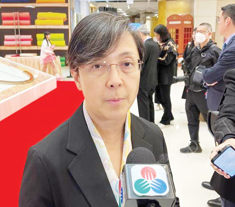 Senna Fernandes talks to reporters on the sidelines of a Shenzhen tourism promotion activity yesterday afternoon at Galaxy Macau’s Banyan Tree Macau hotel in Cotai. – Photo courtesy of TDM
