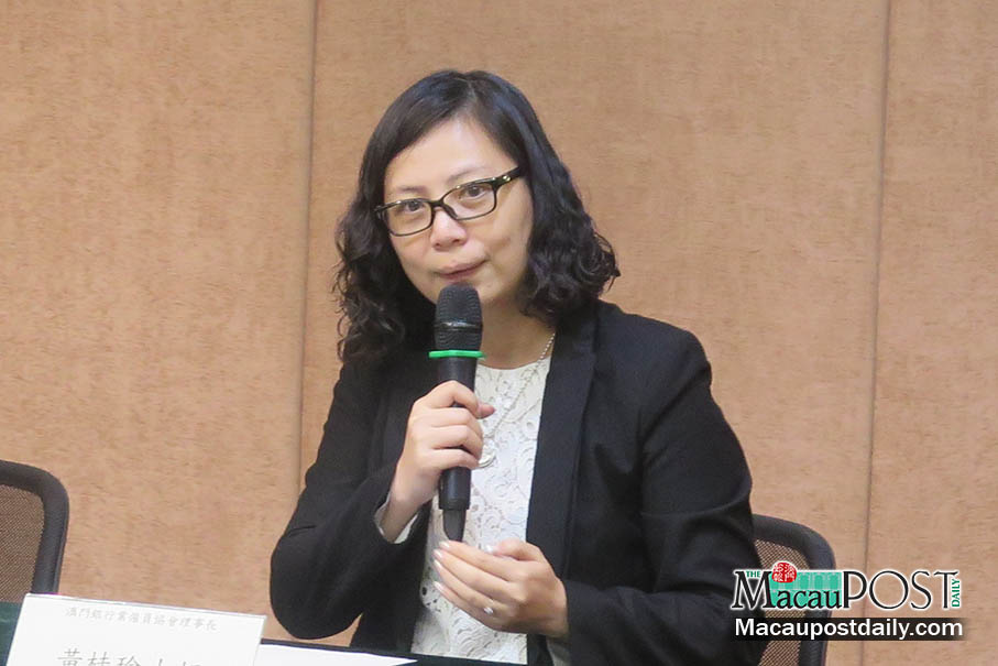 Macau Banking Employees Association President Elaine Wong Kuai Leng speaks during a press conference about the contest, at the Federation of Trade Unions’ ‘Stage’ service centre in Rua do Campo yesterday. Photo: Tony Wong