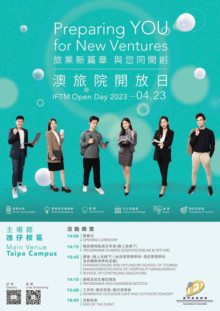 The Macao Institute for Tourism Studies (IFTM) said in a statement yesterday that its Open Day is slated to be held online and offline this Sunday, with the main venue being on its Taipa Campus’s Forward Building.