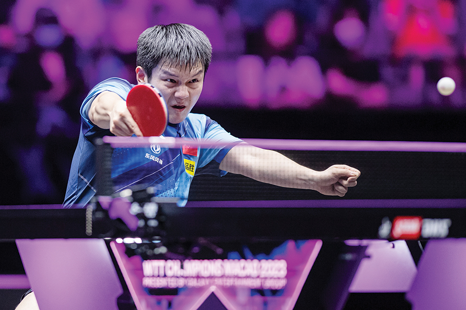 Fan Zhendong of China hits a return during the men’s singles round of 16 match against Lee Sang Su of South Korea at the WTT Champions Macao 2023 at the Tap Seac Multisport Pavilion yesterday. – Xinhua