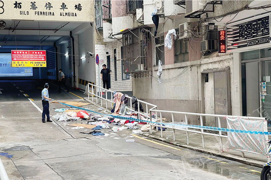 A policeman cordons off area at the entrance of Pak Wai Car Park in Avenida do Conselheiro Ferreira de Almeida yesterday afternoon where various household items including clothing items had been thrown from a residential flat.