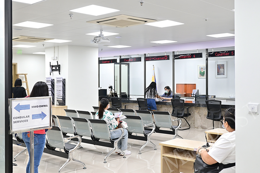 Taking a left after getting out of the lift, past a coat of arms in gold, one will walk through a hall with a wall decorated with pictures of tourism spots in the Philippines before getting to where consular and labour-related services are provided in a comparatively bigger area, which also boasts a new queueing system in use.