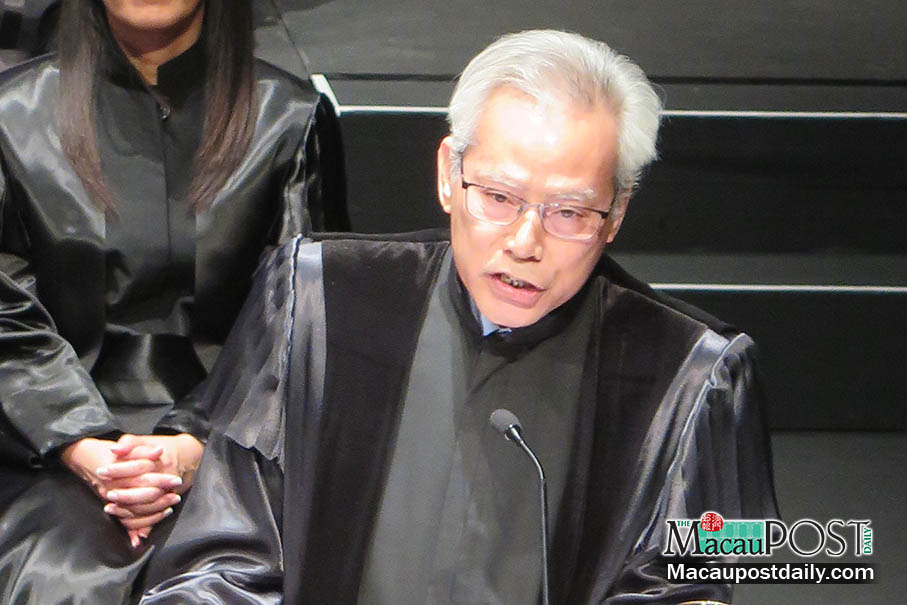 Court of Final Appeal (TUI) President Sam Hou Fai delivers a speech yesterday at the opening ceremony of the Judicial Year 2016/17 at the Macau Cultural Centre in Nape. Photo: Tony Wong