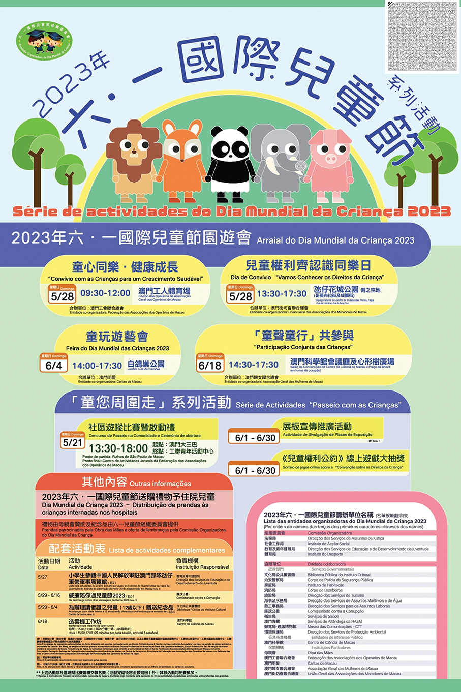 Various government departments and civil society organisations have prepared a series of activities to celebrate International Children’s Day, which falls on June 1, aiming to arouse public awareness of the rights and welfare of children, and also to allow the public enjoy the festive atmosphere and celebrate the special day, according to a Social Welfare Bureau (IAS) statement yesterday.