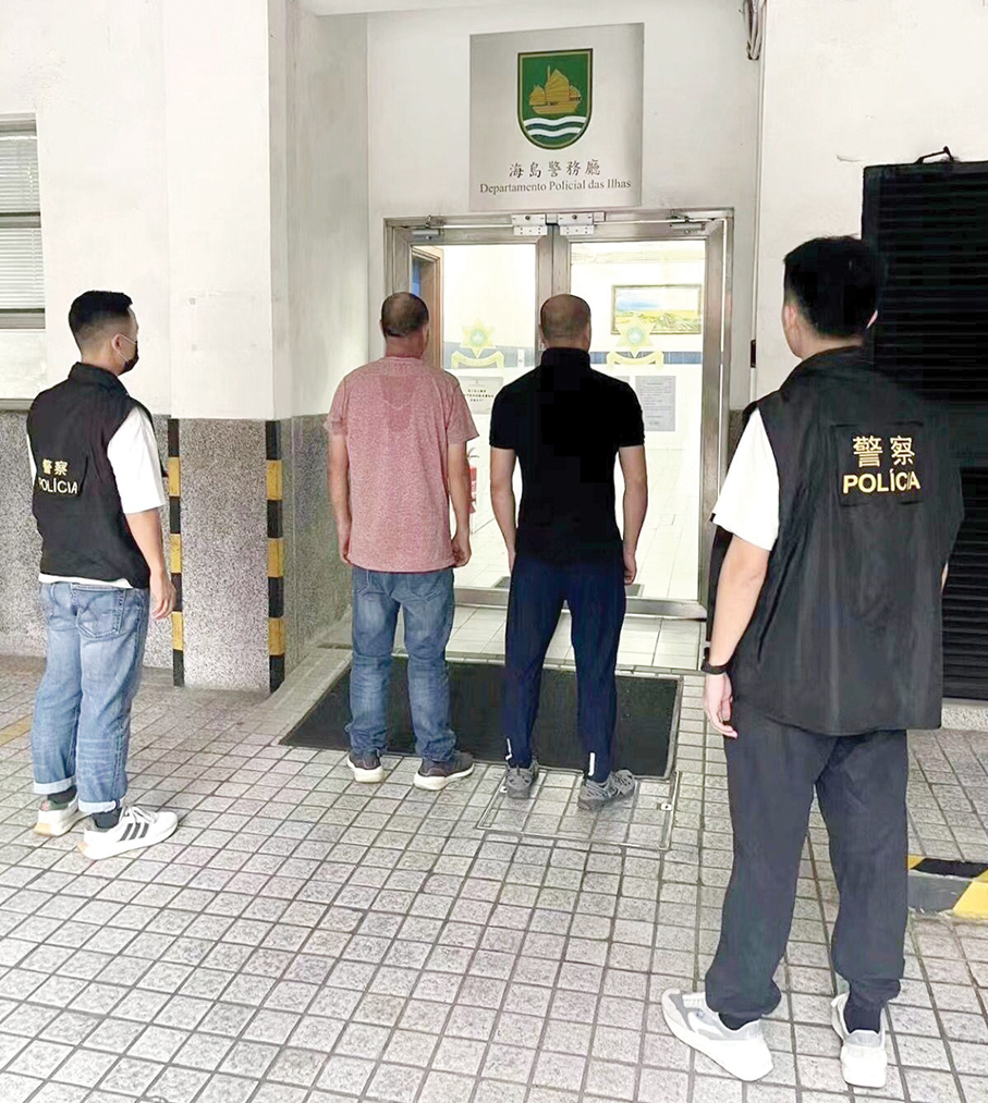 This undated handout photo provided by the Public Security Police (PSP) on Friday shows police officers escorting the two theft suspects to a police station in Taipa.