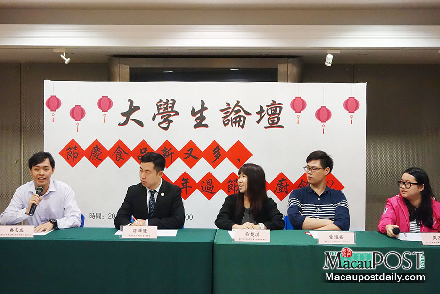Macau General Association of Chinese Students (AECM) Vice Chairman Choi Chi Seng (left) speaks at a forum held on the Macau Polytechnic Institute (IPM) campus yesterday, as Macau University of Science and Technology (MUST) representative Xu Ze Long (second from left), IPM representative Annie Ng Cho Kei (centre), City University of Macau (CityU) representative Dong Kai Qi (second from right) and AECM Current Affairs Analyst Lara Leong Si Nga are looking on. Photo: Annie Cheung