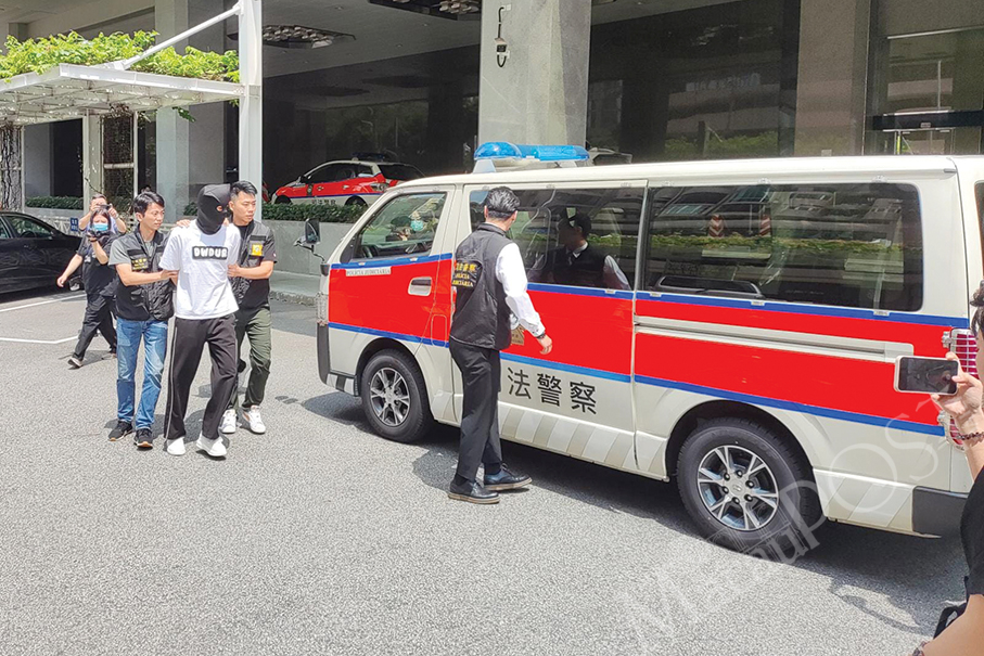 Judiciary Police (PJ) officers escort the hooded suspect to a PJ vehicle outside the PJ headquarters in Zape yesterday. – Photo: William Chan