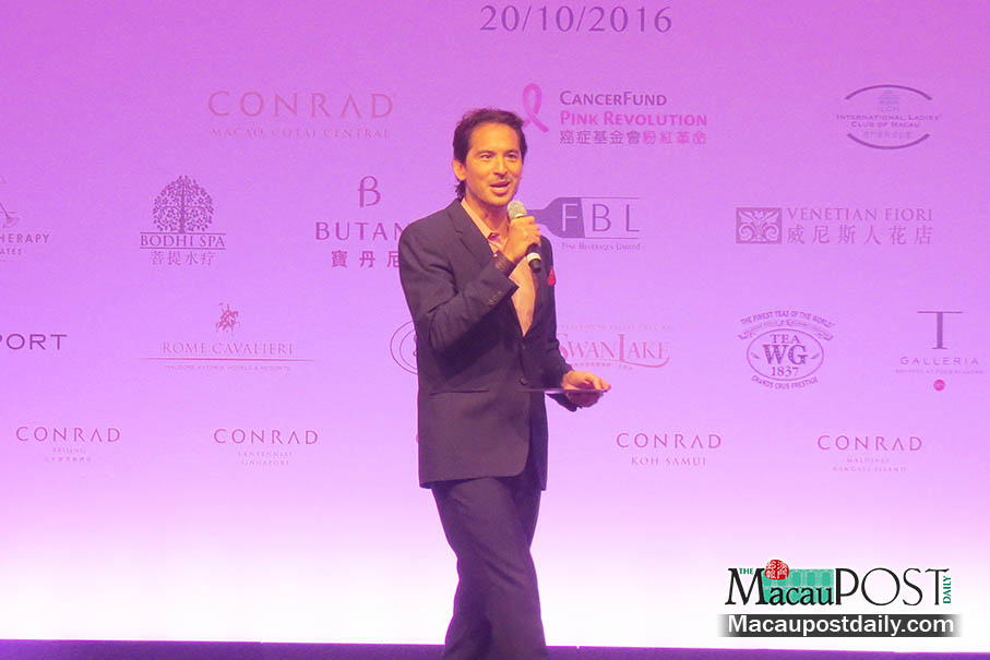 MC Sean Lee-Davies speaks during the Pink Inspired Charity Lunch 2016 at Conrad Macao Cotai Central yesterday. Photo: Lesley Wells