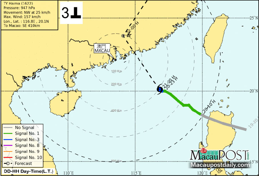 The No. 3 signal was hoisted as Severe Typhoon Haima was 430 kilometres south-east of Macau at 11 p.m. The storm was heading north-west at about 25 kilometres per hour, moving towards the eastern coast of Guangdong province, according to the bureau.