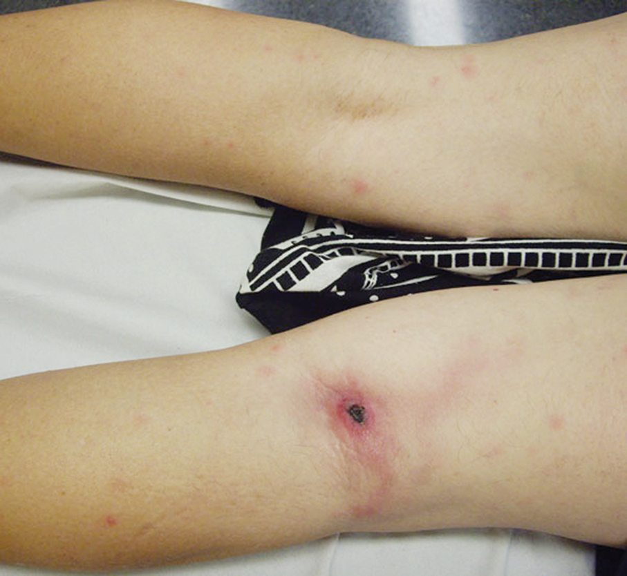 This photo taken in 2011 shows an eschar on a patient’s popliteal (behind the knee) area. – Photo courtesy of US Centers for Disease Control and Prevention (CDC)