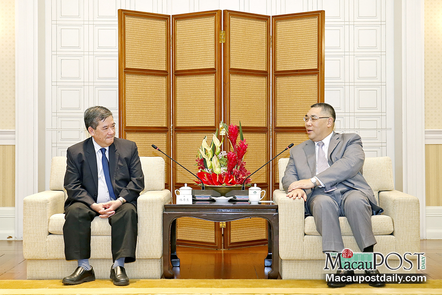 Chief Executive Fernando Chui Sai On (right) meets with legislator-cum-unionist Lam Heong Sang at Government Headquarters yesterday. Lam headed a delegation of the Macau Federation of Trade Unions for a meeting with Chui about the latter’s 2017 Policy Address next month. Lam is a vice-chairman of the federation commonly known as Gung Luen. Photo: GCS