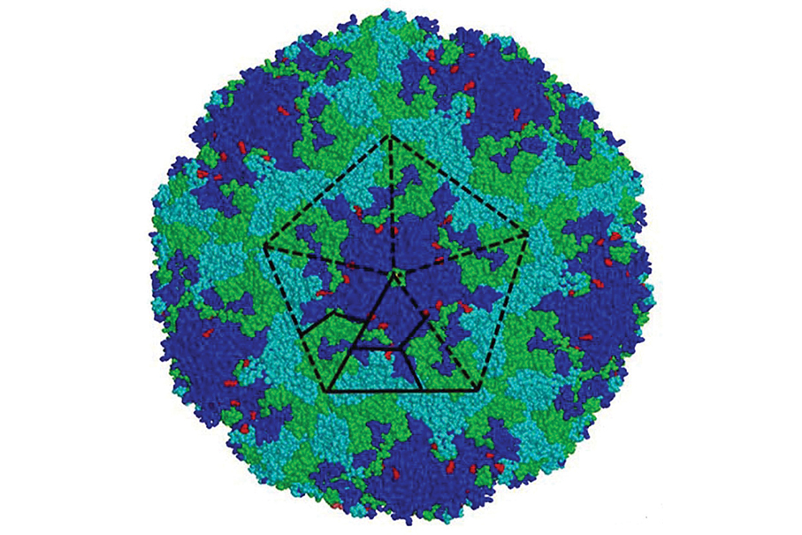 This photo shows Enterovirus 71 (EV71) genotype A virus particle. VP1 (blue), VP2 (cyan), VP3 (green) and VP4 (yellow) proteins are presented in whole virus particle.