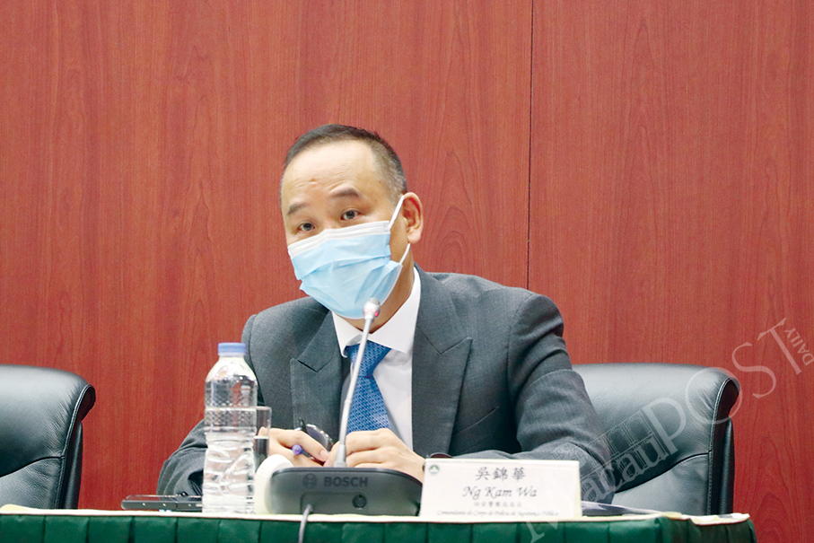 Public Security Police (PSP) Commissioner Ng Kam Wa addresses yesterday’s press conference about Macau’s 2023 first-quarter crime statistics at the S. Francisco Barracks.
