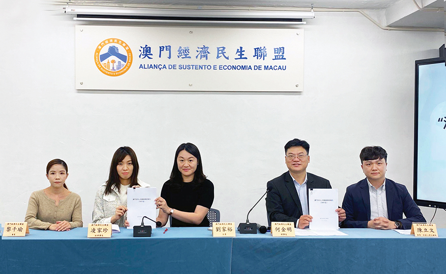 Five representatives of the Macau Economic and Livelihood Alliance, including its Chairwoman Lao Ka U (third from left) and President Ho Kam Meng (fourth from left), pose during Friday’s press conference at the group’s office on Avenida da Amizade. – Photo courtesy of TDM