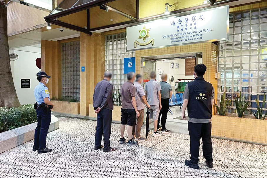 This undated handout photo provided by the Public Security Police (PSP) yesterday shows PSP officers escorting the five illegal mahjong parlour suspects to a police station.