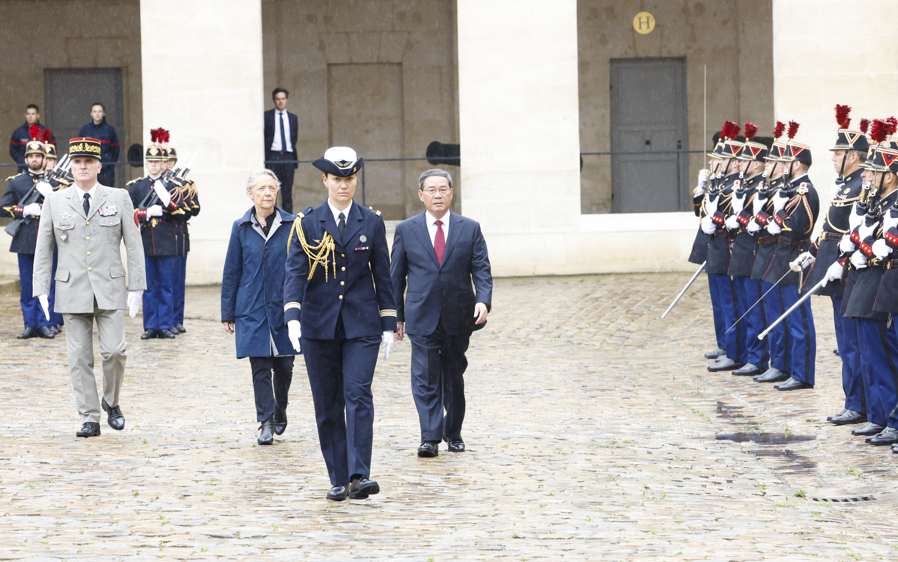 Before the talks, Borne held a grand welcome ceremony for Li at Les Invalides. The national flags of China and France were hoisted at the Esplanade des Invalides, and a French military band played the national anthems of China and France. Accompanied by Borne, Li inspected the French Republican Guard.