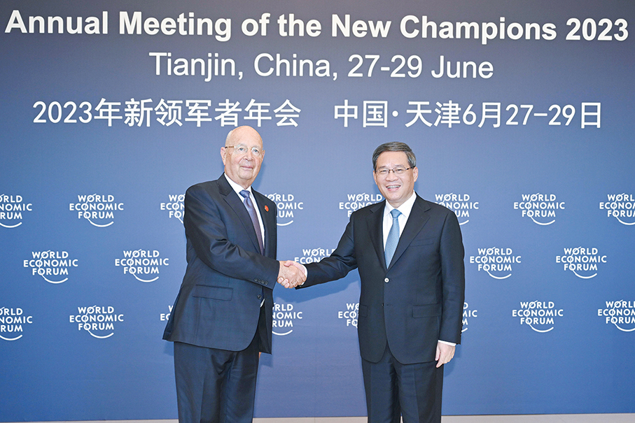 Premier Li Qiang (right) shakes hands with Executive Chairman of the World Economic Forum (WEF) Klaus Schwab in Tianjin on Monday. Schwab, 85, a German engineer and economist, founded the international forum in 1971. – Xinhua