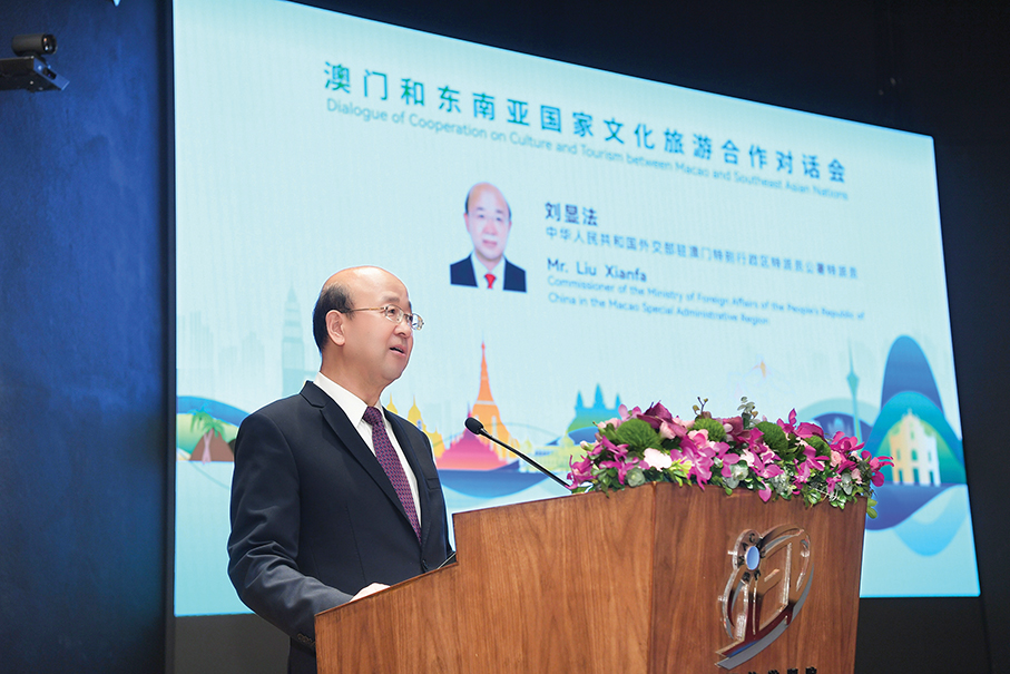 Commissioner of the Ministry of Foreign Affairs in the Macau SAR Liu Xianfa delivers his opening speech at the one-day “Dialogue of Cooperation on Culture and Tourism between Macau and Southeast Asian Nations (ASEAN)” at the Macao Institute for Tourism Studies (IFTM) yesterday afternoon. – Photo courtesy of the Commissioner’s Office