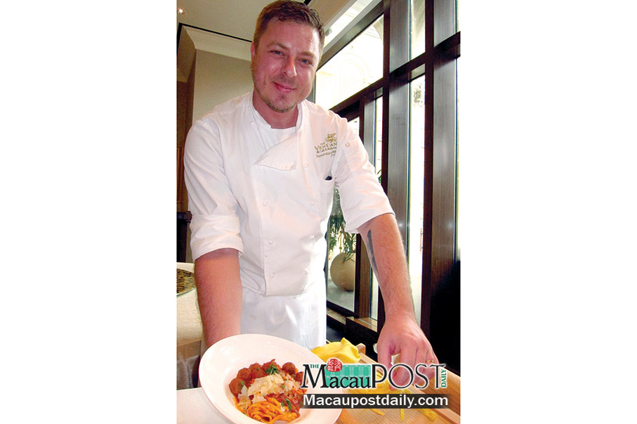 Portofino’s Senior Chef Domenico Cicchetti shows a “Chitarrina con polpettine after demonstrating how the chitarra is made with a wooden box attached with strings. Photo: Monica Leong