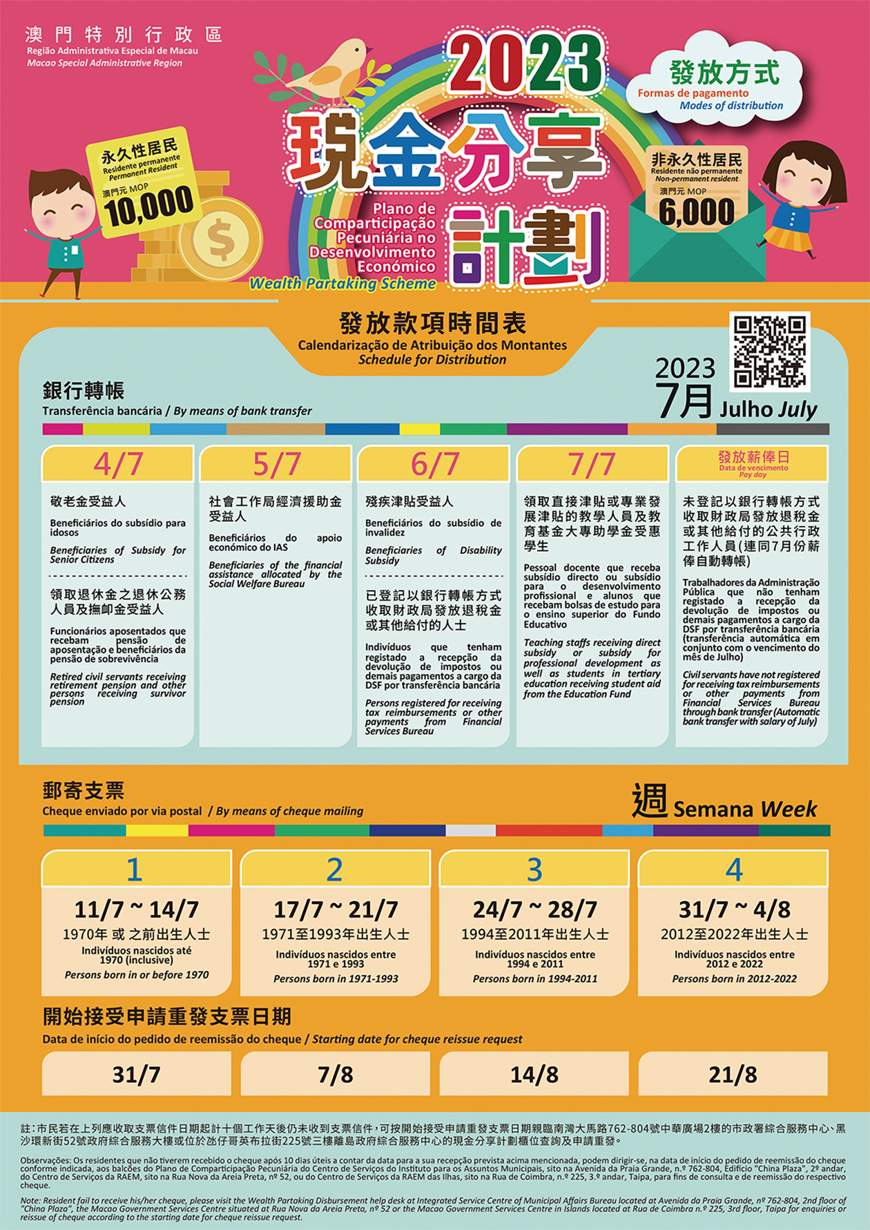 This poster provided by the Finance Service Bureau’s (DSF) on Saturday shows the payment schedule of the government’s annual “wealth-sharing” cash handouts starting tomorrow.
