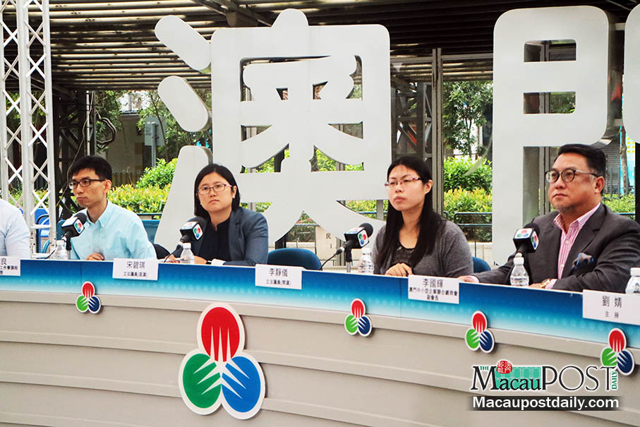Victor Lei Kuok Fai (first from right), who chairs the Federal General Commercial Association of Macau Small- and Medium-sized Enterprises, lawmakers Ella Lei Cheng I (second from right) and Song Pek Kei (second from left) and Dicky Lai Wai Leung, a social work professor at the Macau Polytechnic Institute (IPM), participate in yesterday’s forum in Areia Preta Park. Photo: Debby Seng