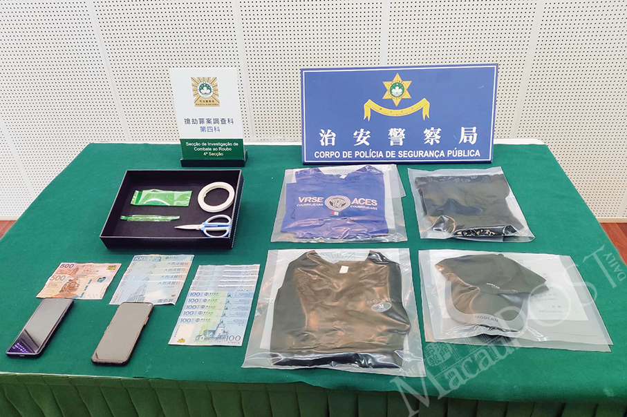 Evidence seized from the two mainland suspects, such as bank notes, clothes, a pair of scissors and double sided adhesive tape is displayed during yesterday’s special press conference at the Judiciary Police (PJ) headquarters.