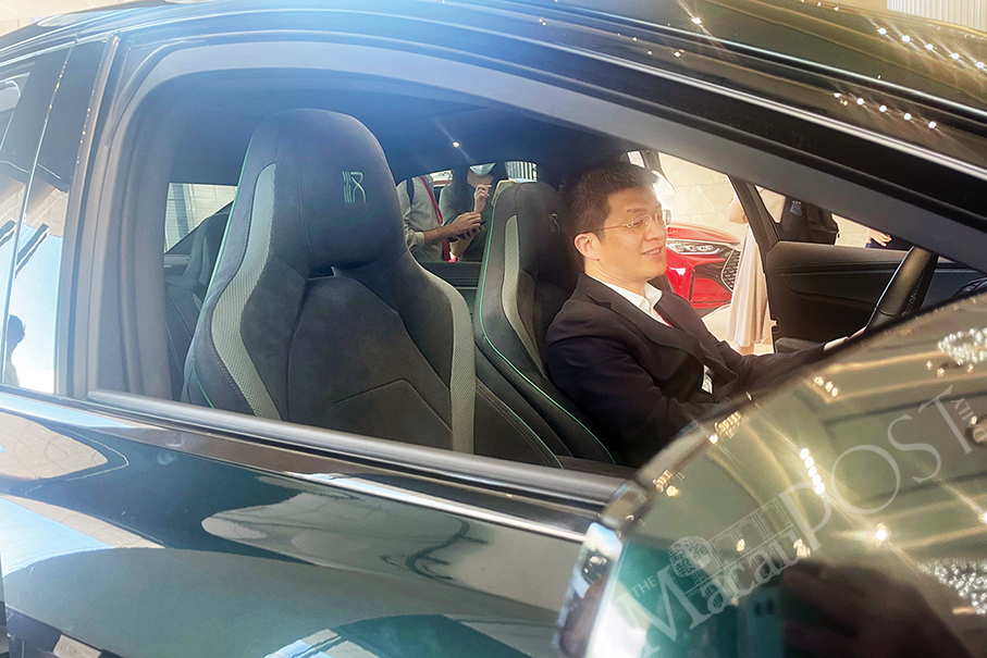 Counsellor of the Office of the Commissioner of the Ministry of Foreign Affairs of the People’s Republic of China in the Macau Special Administrative Region (MSAR) Gao Yuan tries out a display car during yesterday’s visit to BYD Company Limited in Shenzhen.