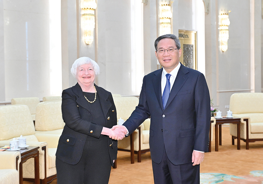Caption: Premier Li Qiang (right)shakes hands with US Treasury Secretary Janet Yellen at the Great Hall of the People in Beijing today. - Xinhua