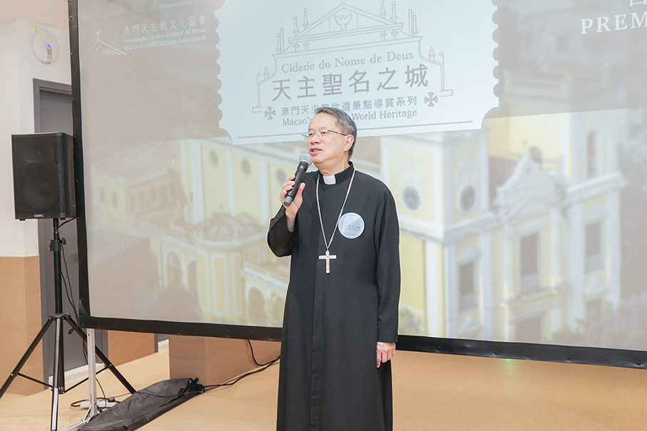 This handout photo taken and released on Friday shows Macau Catholic Diocese Bishop and ACCM Chairman Stephen Lee Bun Sang giving his opening remarks during the premiere of the new video series “Cidade do Nome de Deus” - Macao‘s Catholic World Heritage in Rua Formosa.