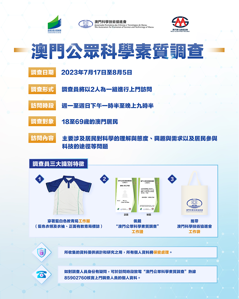 During the survey period, the statement said, Macau Student Affairs Association members will work in pairs to visit residents from door to door to interview them at home, wearing blue and white uniforms with the logo of the bureau, carrying “Macau Public Science Literacy Survey” badges and Association for Promotion of Science and Technology of Macau bags.