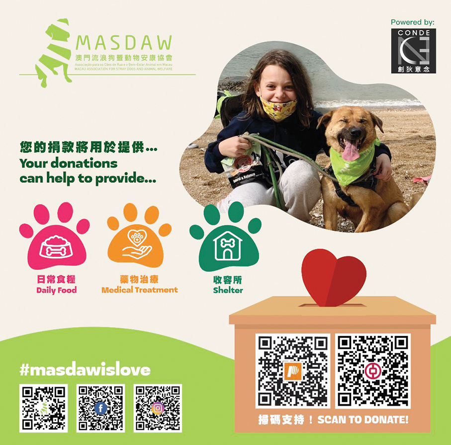 This poster provided by the Macau Association for Stray Dogs and Animal Welfare (MASDAW) yesterday shows some of the platforms for your donations, as well as the association’s social media pages.