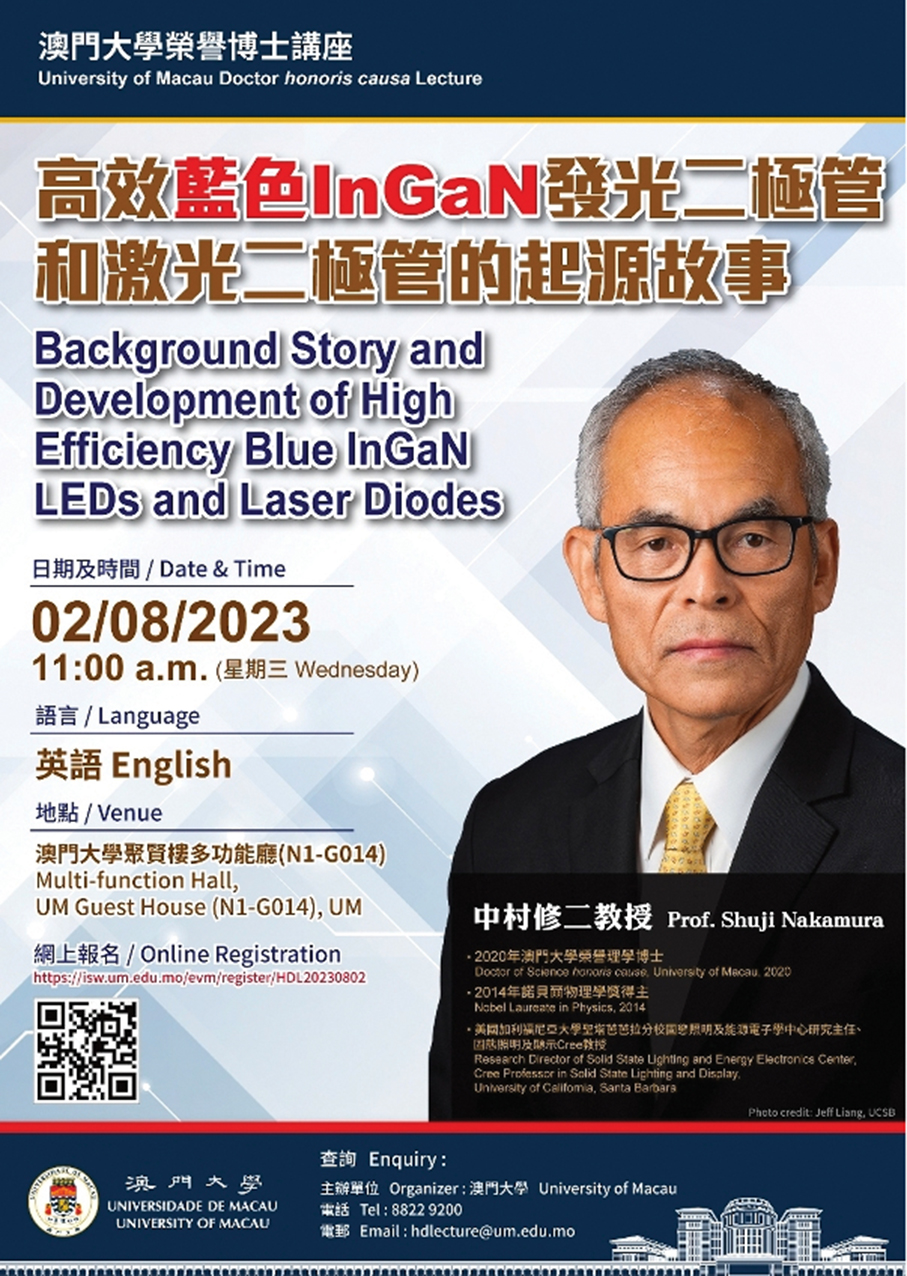 An “honoris causa” lecture featuring keynote speaker Prof Shuji Nakamura, who won the 2014 Nobel Prize in Physics, is slated to take place at the University of Macau (UM) on August 2, according to a UM statement on Friday.
