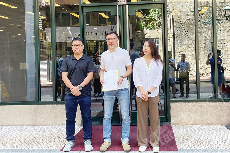 Macau Synergy Association President Ian Heng Ut (centre), Vice President Ron Lam U Tong, a directly-elected lawmaker (left) and Chairwoman Che I Kei pose with a petition addressed to Chief Executive Ho Iat Seng, at Government Headquarters on Rua de S. Lourenço. – Photo: Yuki Lei
