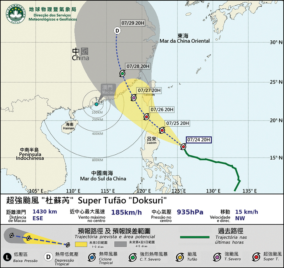 Background information released by SMG shows that “Dussuri” will enter Macau’s 800-kilometre zone on Wednesday afternoon, by then the bureau will assess the need for issuing a Tropical Cyclone Warning.