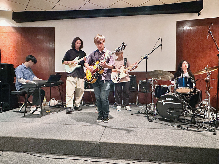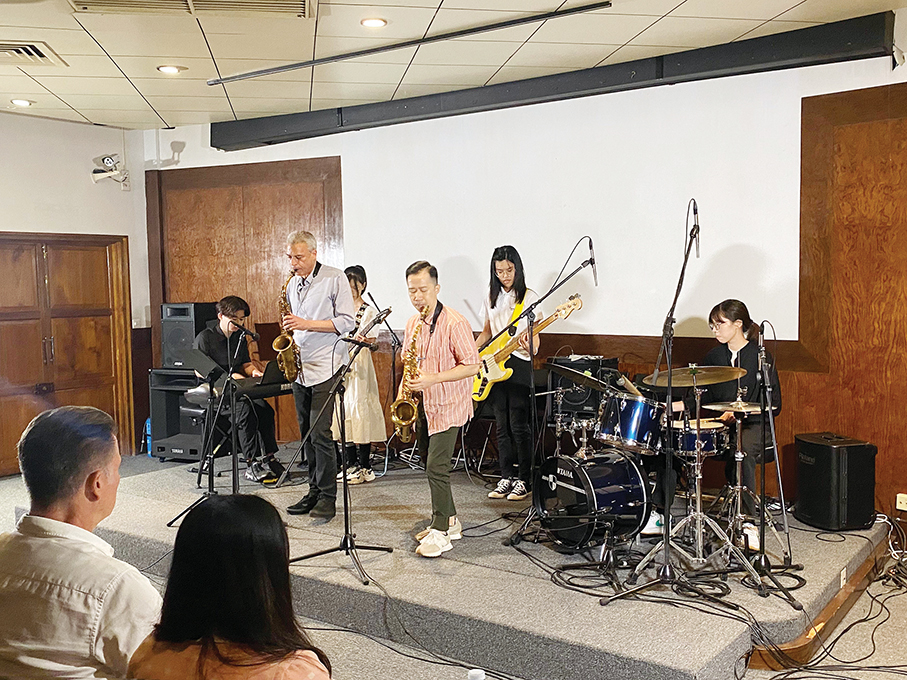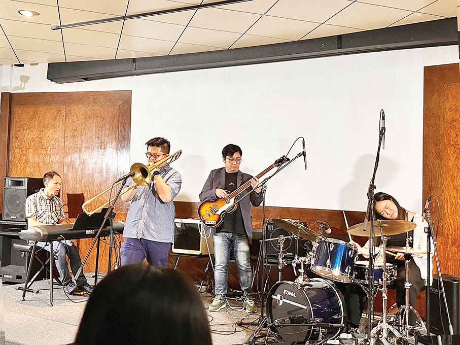 This photo shows the MJPA teacher’s quartet, featuring Gregory on the trombone, Mars on the bass, Carmen on the drums and Ao Fai on the keyboard.