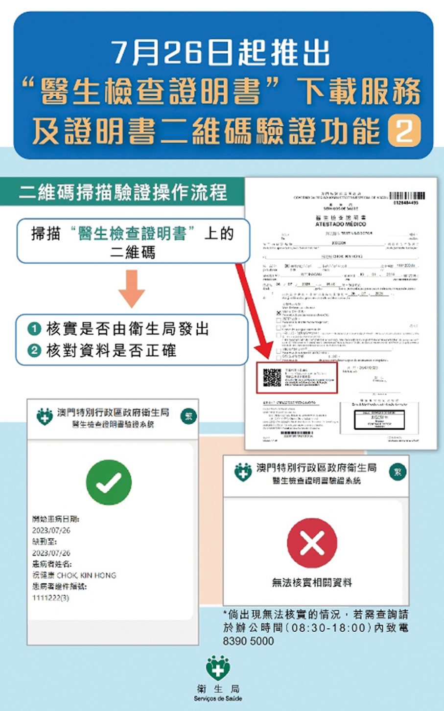 In order to verify the authenticity of the certificate, members of the public can scan the QR code on the certificate through their mobile phone to verify whether it was issued by the Health Bureau and whether the information is correct.