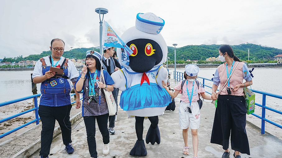 This undated handout photo provided by the Macau Government Tourism Office (MGTO) on Tuesday shows the official MGTO mascot Mak Mak in the company of a number of tourists and two tour guides in Coloane.