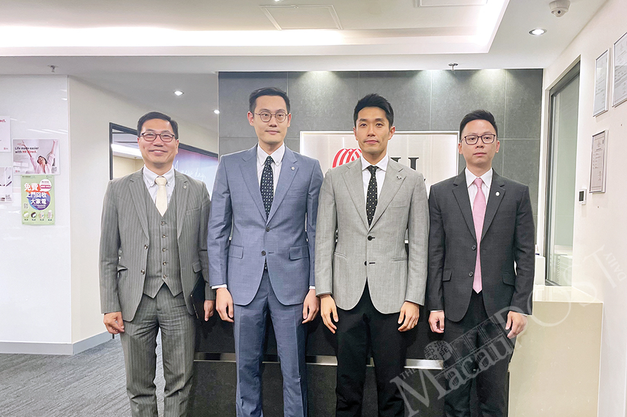 JLL Macau Director of Valuation Advisory Services Mark Wong Choi Si (second from left) and Senior Manager of Leasing Matt Kou Ieng Kit (right), as well as JLL Macau & Zhuhai General Manager Oliver Tong Wai Lok (second from right) and Property and Asset Management Head Ben Tse Man Pan pose yesterday before the US real-estate agency’s Macau Mid-year Property Review press conference at its office in the Finance and IT Center of Macau (FIT) in Nam Van. – Photo: Yuki Lei