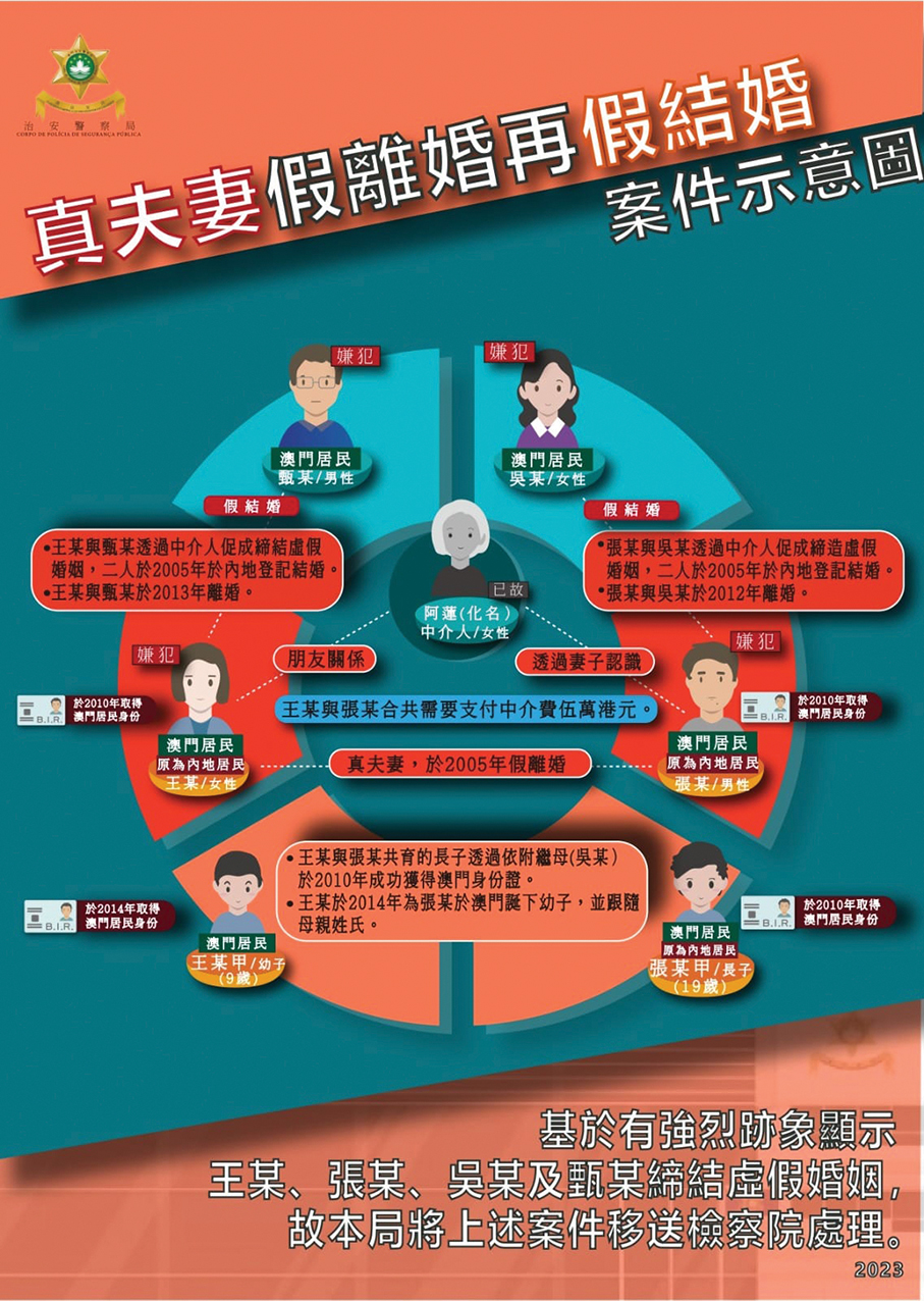 Wong noted that Zhang and Wang married in 1997 and with the assistance of a middlewoman, who has meanwhile passed away, they divorced in 2005 so that they could marry Ng and Ian later in the same year respectively. After obtaining their local ID cards, Zhang and Wang applied for their elder son from the mainland to move in 2010 to Macau who obtained Macau residency later that year. The two bogus couples formalised their divorces in 2012 and 2013 respectively.