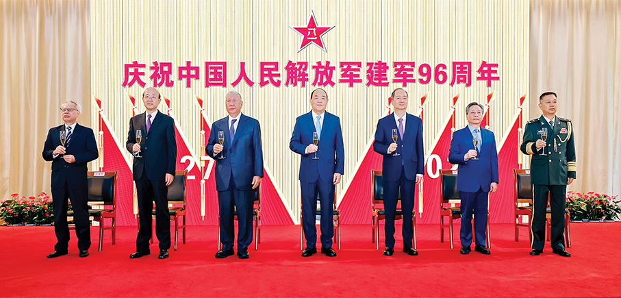 Chief Executive Ho Iat Seng (centre), Central People’s Government Liaison Office in Macau Director Zheng Xincong (third from right), Foreign Ministry Commissioner in Macau Liu Xianfa (second from left), National Committee of the Chinese People’s Political Consultative Conference (CPPCC) Vice Chairman Edmund Ho Hau Wah (third from left), People’s Liberation Army (PLA) Macau Garrison Commander Yu Changjiang (right), Legislative Assembly (AL) President Kou Hoi In (second from right) and Court of Final Appeal (TUI) President Sam Hou Fai (left) offer a toast during a reception to mark the 96th anniversary of the PLA at the PLA garrison barracks in Taipa yesterday. – Photo: GCS
