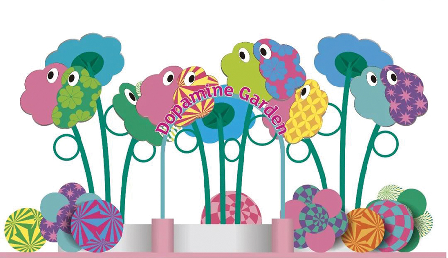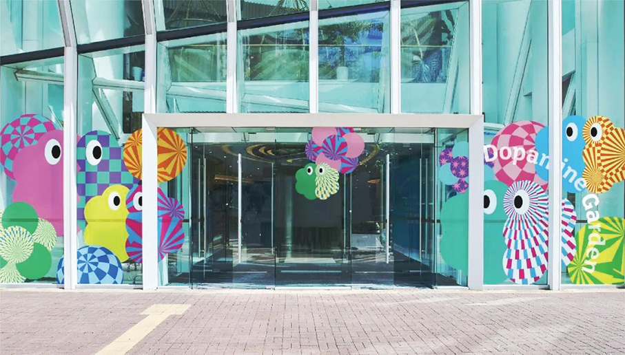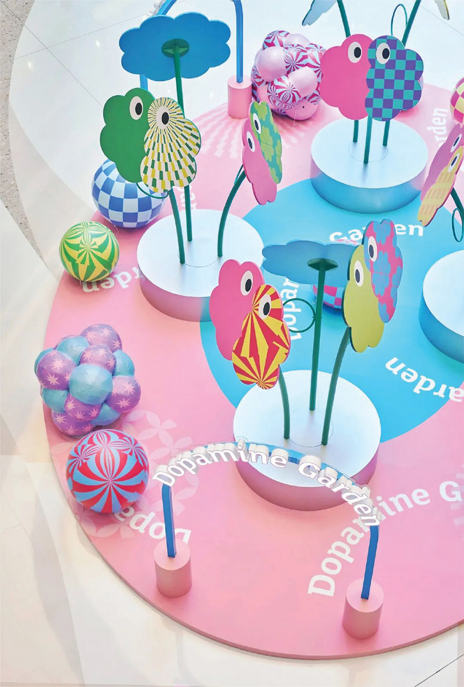 The Dopamine Garden, an art installation situated in the centre of the mall’s atrium, is positioned directly under a skylight. The installation features colourful spheres, plant-like figures with brain-shaped flowers, and seating platforms for visitors, aiming to appeal to a wider audience, especially families.