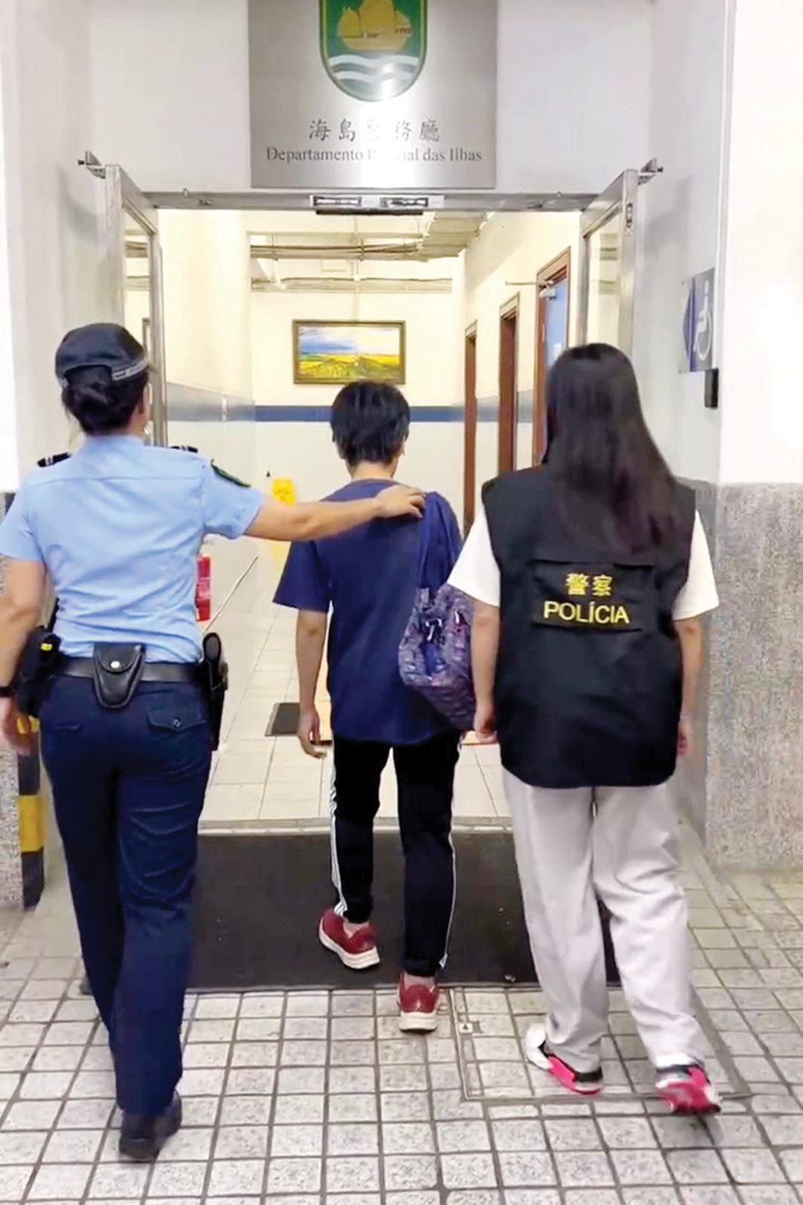 This undated photo provided by the Public Security Police (PSP) yesterday shows PSP officers escorting the local suspect to a police station.