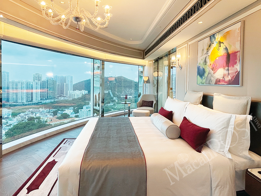 This photo taken yesterday during a media tour arranged by resort operator Galaxy Macau shows a suite of Raffles at Galaxy Macau in Cotai, which opened on Wednesday. – Photo: Yuki Lei