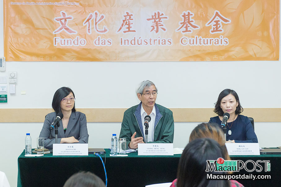 Cultural Industries Fund (FIC) President Leong Heng Teng (centre), flanked by the fund’s directors Davina Chu Miu Lai (left) and Mok Ian Ian, address yesterday’s briefing at the fund’s office. Photo: Debby Seng