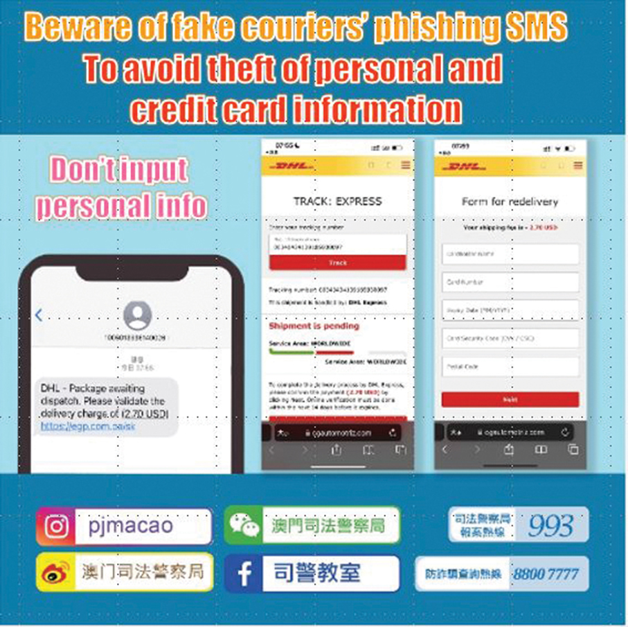 This poster provided by the Judiciary Police (PJ) yesterday warns members of the public of phishing SMS messages from fake couriers.
