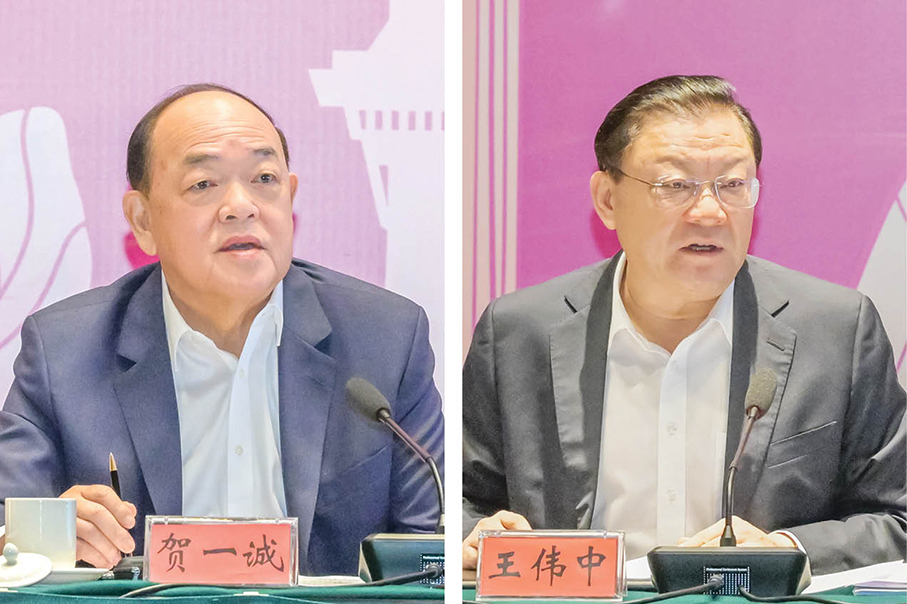 Macau Chief Executive Ho Iat Seng (left) and Guangdong Governor Wang Weizhong address yesterday’s meeting of the Administrative Committee of the Guangdong-Macau In-depth Cooperation Zone in Hengqin. – Photos: GCS