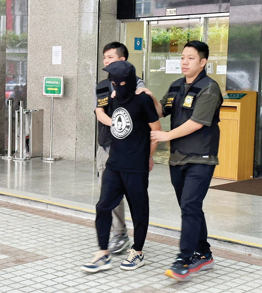 The hooded local fraud suspect is escorted by police officers from the Judiciary Police (PJ) headquarters in Zape to a PJ vehicle after Friday’s special press conference.